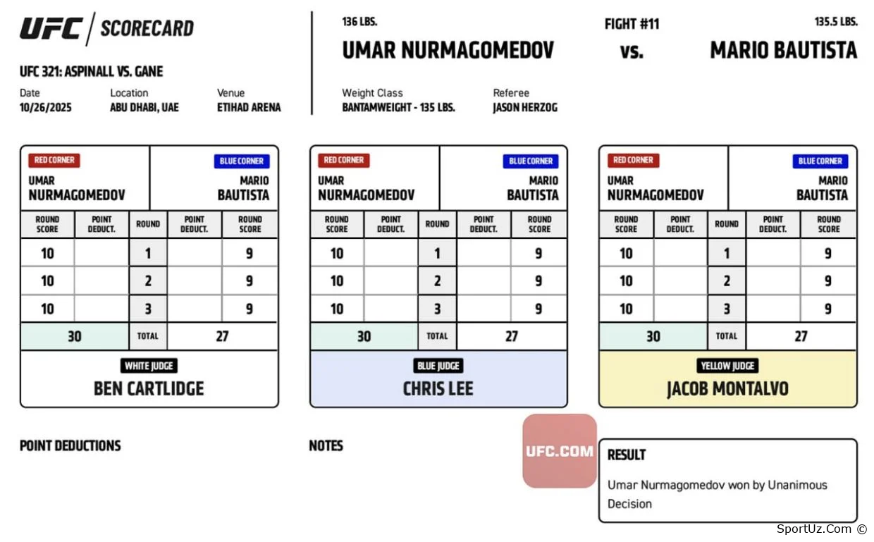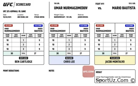 UFC matbuot xizmati UFCning eng yengil vazn bo'yicha chempionlik unvoniga da'vogar bo'lgan rossiyalik Umar Nurmagomedov va UFC reytingining 61 kg gacha bo'lgan toifasidagi sakkizinchi raqami amerikalik Mario Bautista o'rtasidagi jangning hakamlik kartalarini e'lon qildi.